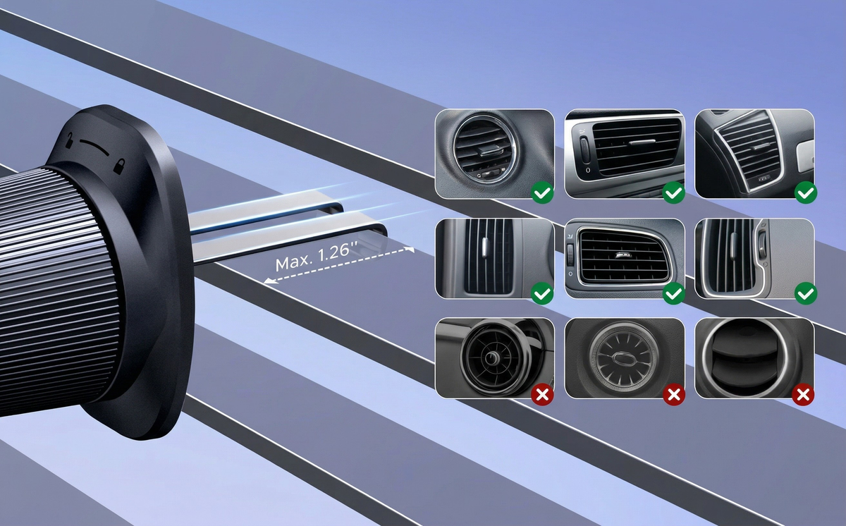 Say goodbye to mounts that constantly slip. The upgraded steel hook mechanism tightly grips your air vent blades, while the massive 23N magnetic force keeps your phone locked in place. Compatible with almost all horizontal and vertical vents.