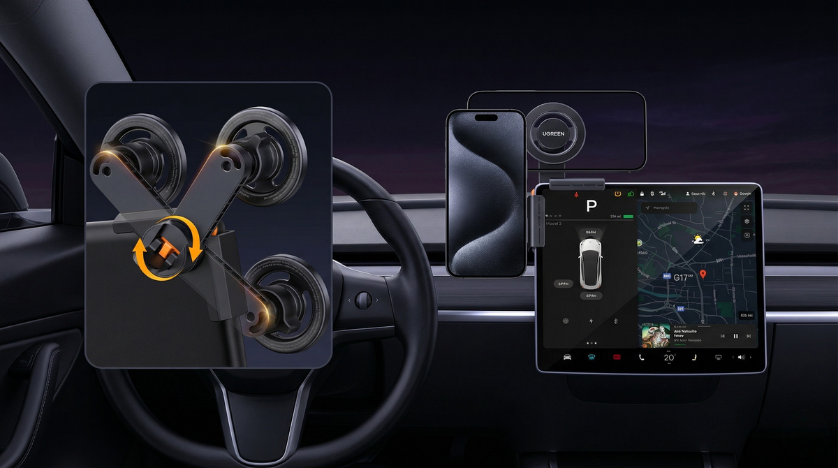 Keep your dashboard clean and distraction-free. The innovative foldable arm allows the mount to completely hide behind your floating screen when not in use. When you need it, simply flip it out for a powerful, zero-rattle MagSafe hold.